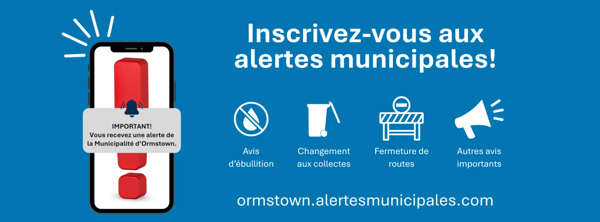 Inscrivez-vous aux alertes municipales et recevez les alertes comme les avis d’ébullition et des changements aux services municipaux par texto, téléphone ou courriel.
